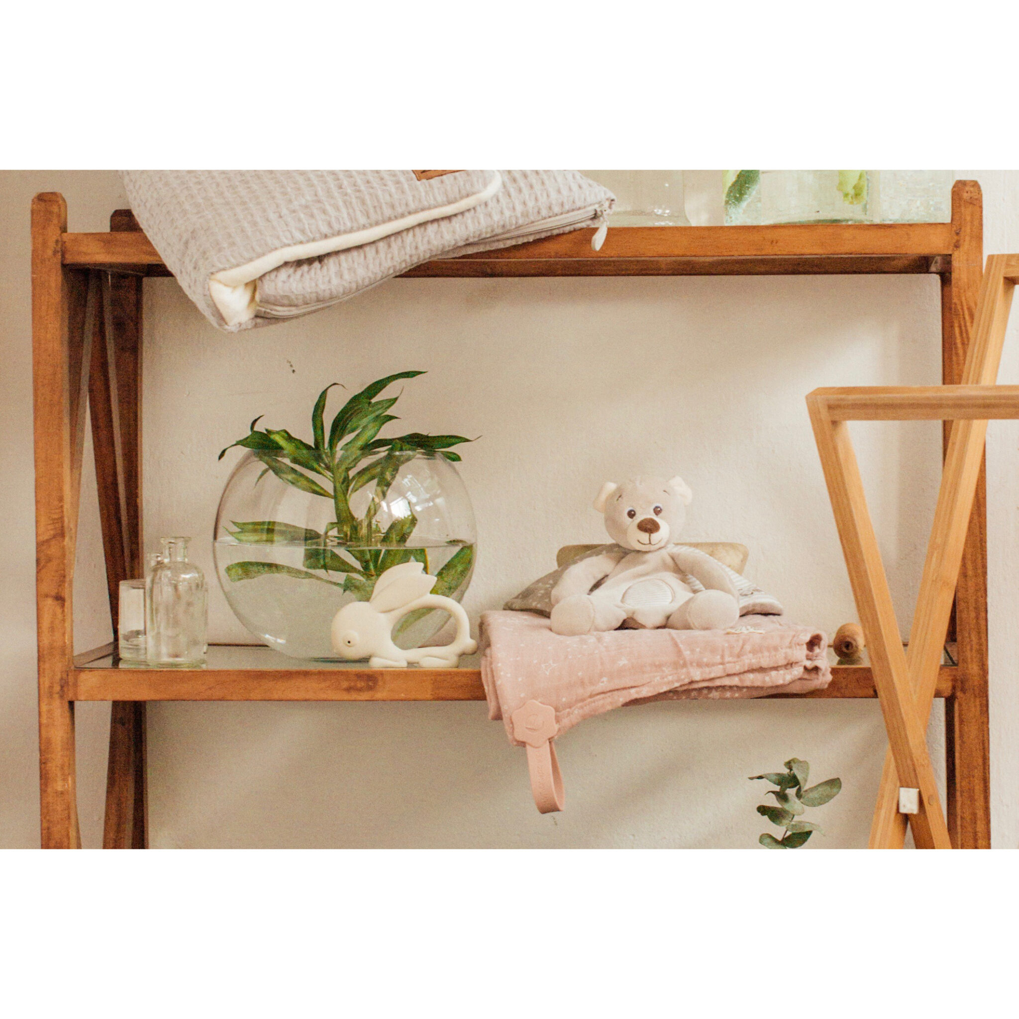 Grickalica za zube u obliku zečića napravljena od prirodnog lateksa dobivenog iz drveta kaučukovca. Mekani prsten služi kao igračka ili kao grickalica za ublažavanje nelagode kod rasta zubi i za masažu bolnih desni. Maleni desni obožavat će teksturu kaučuka! Zbog svoje meke strukture i oblika prirodna grickalica svršeno će odgovarati malenim ručicama. Neka grickalica od prirodnog lateksa uvedite vašu bebu u zdrave životne navike već od najmanje dobi.
