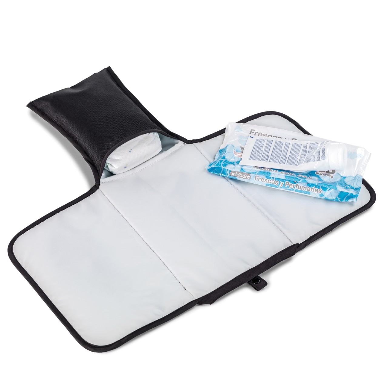 - Torbica se može rasklopiti i tako postati praktična podloga za previjanje s bočnim džepom za maramice i/ili pelene; a nakon uporabe može se objesiti za kolica